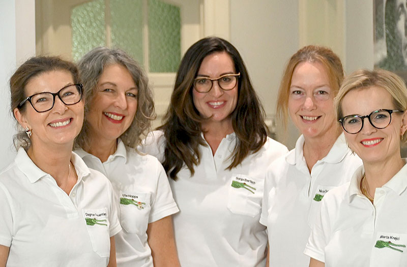 Wussten Sie schon, dass Sie in unserer Zahnarztpraxis in Hamburg auch im Bereich Vorsorge von umfassender Fachkompetenz profitieren? Unser Kolleginnen Dagmar Feuerriegel, Ute Hoppe, Sonja Bartsch, Nicole Dumke und Marta Krejci (Foto von links nach rechts) sind als Dentalhygienikerinnen besonders qualifiziert – sie haben die anspruchsvolle Dentalhygienikerinnenfortbildung erfolgreich absolviert und verfügen über langjährige Erfahrung.